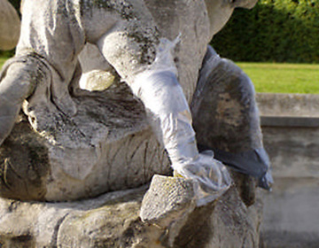 Die Plastiken 08, 09 und 10 wurden mit Hilfe eines Teleskopstaplers abgebaut und in die Hallen der Firma geführt. Figurengruppe 11 wurde nach der Festigung in drei Teilen abgebaut und in die Kartause Mauerbach transportiert. Lose oder absturzgefährdete Bruchstücke wurden vorsichtig abgenommen und sowohl fotografisch als auch graphisch dokumentiert, um sie für die später zu erfolgende Verklebung vorzubereiten. Sämtliche korrodierte Armierungen und Klammern wurden vorsichtig mit feinen Bohrern oder mechanisch mit Hammer und Meißel ausgebaut. Zum Teil konnte dies vor Beginn der weiteren Restaurierungsmaßnahmen geschehen, oft war man aber gezwungen, die Armierungen erst im Zuge der Abnahme schadhafter Ergänzungen zu entfernen. Bei Fehlstellen mit einem Ausmaß von mehr als 5 x 5 cm wurden für die Herstellung von Natursteinergänzungen vorerst Modellvorlagen aus Ton oder Gips angefertigt. Für die Anpassung an den Originalzustand der Figuren dienten historische Fotografien. Kleinere Fehlstellen wurden mit dem Naturstein angepassten Kunststeinmörteln ergänzt. Nachdem bei dem Kunststeinguss keine Gefahr einer Überfestigung der Oberfläche zu erwarten ist, wurde in Absprache mit Auftraggeber und BDA beschlossen, die Fassung dieser Figurengruppe auf silikatischer Basis auszuführen. Bei den Figurengruppen 09 und 10 aus Naturstein wurde nach Absprache mit Auftraggeber und BDA beschlossen, dass eine Gruppe eine reine Kalkschlämme, die andere Gruppe eine Silikonfassung erhalten soll. An diesen Objekten soll in Zukunft die Dauerhaftigkeit der Fassungen unter der enormen Wasserbelastung in Brunnensituationen beobachtet werden.